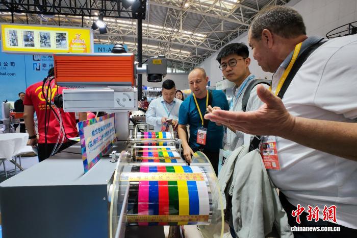 9月24日,天津,外洋推销商观光冰激凌包拆激光挨码机。中新社记者 佟郁 摄